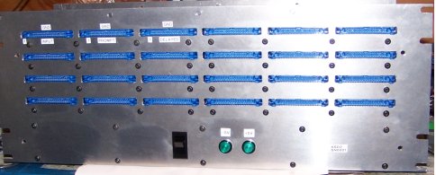 This is one of the 16-channel boards. The front connectors are, from the left: input, prompt output, and first delayed output. The rear connector is the second delayed output. Looking at each connector, the first signal pin is at the lower left. The top row of pins are grounds. The last two pins to the right are not used.
